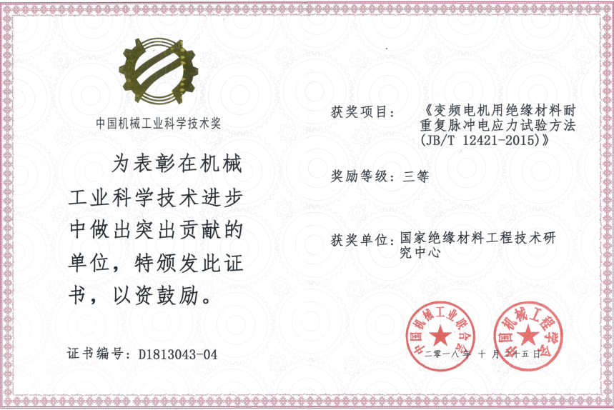 由中國機(jī)械工業(yè)聯(lián)合會和中國機(jī)械工程學(xué)會共同設(shè)立“中國機(jī)械工業(yè)科學(xué)技術(shù)獎”,是中國機(jī)械領(lǐng)域最具權(quán)威的獎項(xiàng)之一。近日,2018年度中國機(jī)械工業(yè)科學(xué)技術(shù)獎獲獎項(xiàng)目公布,我公司(國家絕緣材料工程技術(shù)研究中心)參與制定的行業(yè)標(biāo)準(zhǔn)JB/T12421-2015《變頻電機(jī)用絕緣材料耐重復(fù)脈沖電應(yīng)力試驗(yàn)方法》榮獲 “中國機(jī)械工業(yè)科學(xué)技術(shù)獎” 三等獎。此次獲獎?wù)f明公司一如既往的發(fā)揮著行業(yè)示范帶頭作用,爭先擁有規(guī)則的話語權(quán),為公司提高核心競爭力和產(chǎn)品創(chuàng)新能力提供了助力。